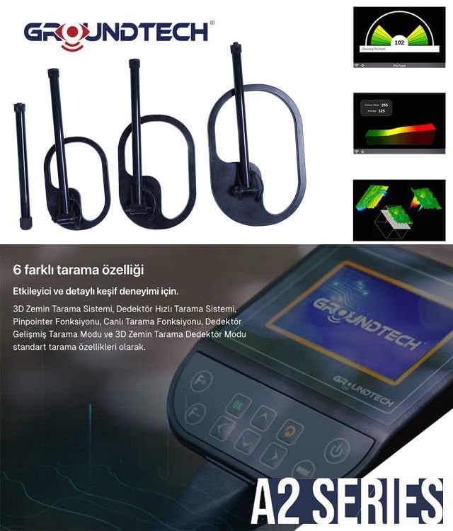 The new generation A2 Model is an advanced ground scanning detector that allows you to detect underground anomalies and perform 3D analysis. Designed as a practical and multi-purpose metal detector and 3D ground scanning device, the A2 Model offers integrated and multi-functional solutions for professional treasure hunters, archaeological treasure seekers and for exploring underground structures. The device is equipped with six different scanning modes.