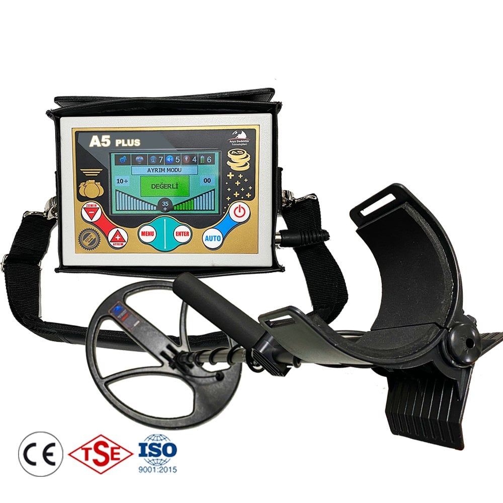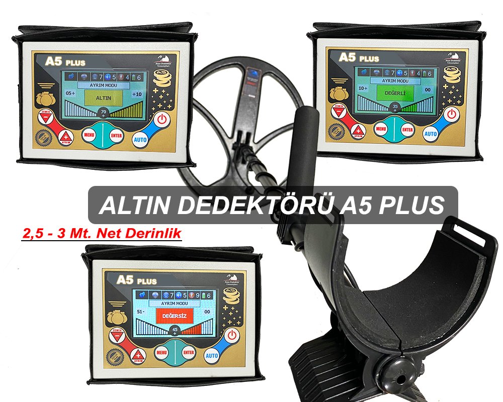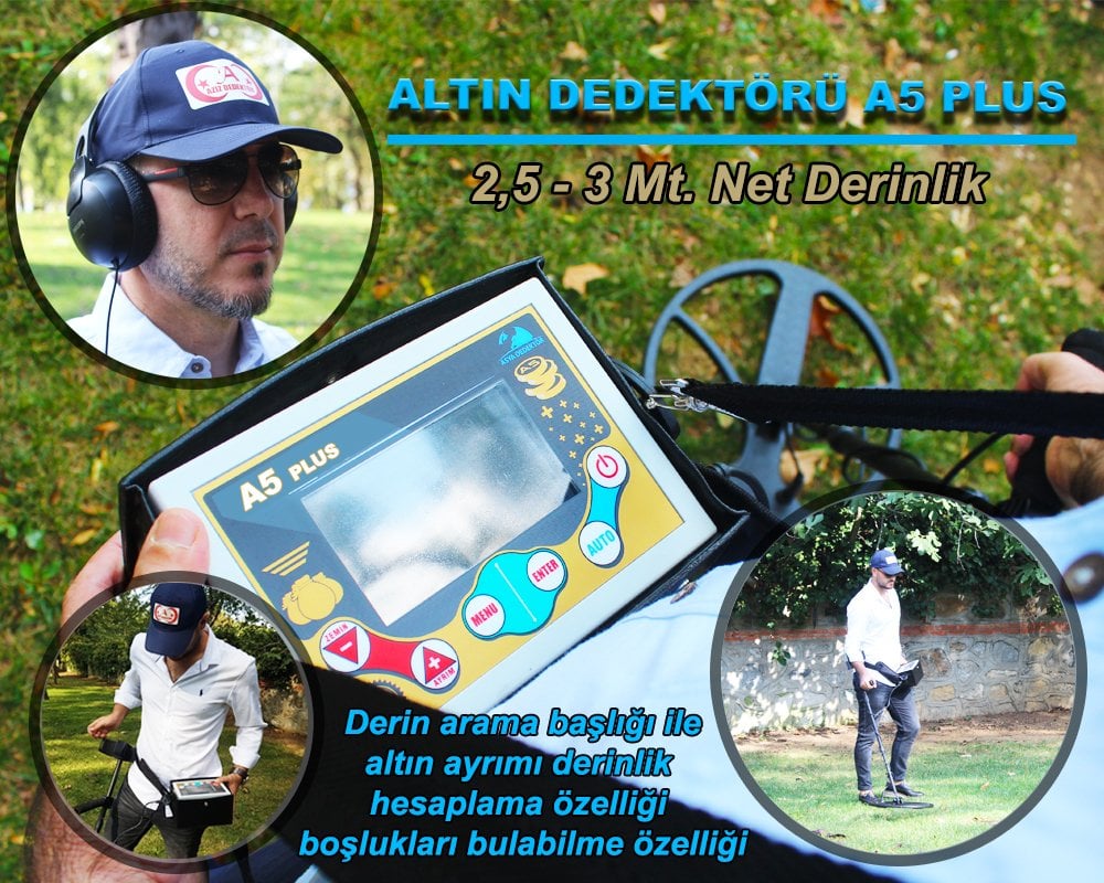 آشکارساز A5، طلای عمیق و ردیاب جستجوی گنج 2.5-3 Mt. اعماق دارد A5 plus به زبان های دنیا به غیر از ترکی طراحی و تولید می شود. A5 plus توانایی تشخیص اشیاء طلا، قطعات و سکه های برنزی، سکه های نقره و جواهرات را در مقبره های اتاقی زیرزمینی، تونل ها و چاه های بسته ساخته شده در سنگ ها در عمق 2.5-3 متری دارد.