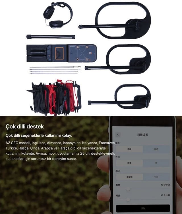 علاوه بر تمام ویژگی های برجسته مدل A2، مدل A2-GEO به سیستم مقاومتی مجهز است. این سیستم به شما امکان می دهد منابع آب زیرزمینی، تونل های زیرزمینی، مقبره های باستانی و غارها را از سطوح بسیار عمیق تر شناسایی کنید. اسکن سریع در چهار خط را با سیستم های اسکن دستی و خودکار امکان پذیر می کند و نتایج را می توان به صورت سه بعدی در برنامه Groundtech Suite تجزیه و تحلیل کرد.